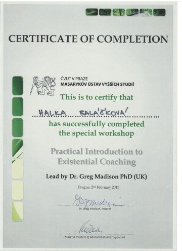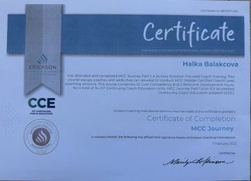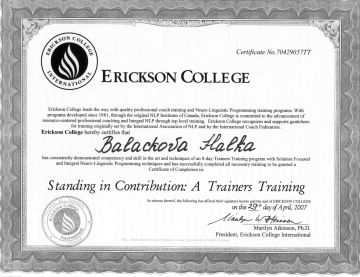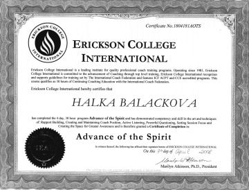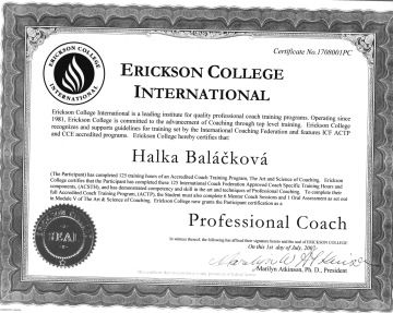 Erickson Certified Professinal Coach, 2010 - oficálně certifikovaným koučem. V tuto dobu jsem taky získala PCC u ICF.