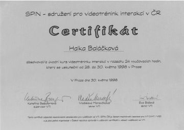 Videotrénink interakcí. V tomto programu jsme se pod vedením úžasné dámy, paní Vlaďky Moravčíkové, učili pracovat citlivě se záznamy s kamerou a hledat v nich to dobré. To dělám dodnes Krásný výcvik z roku 1998. Děkuji za něj.