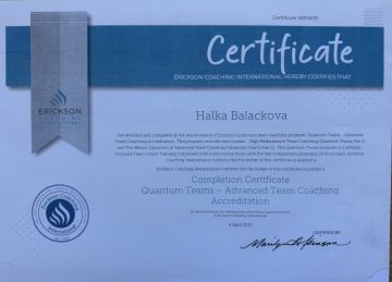 Ing. Halka Baláčková, MBA, PCC, ACTC u ICF, neboli Professional Certified Coach a Advanced Certification in Team Coaching pod ICF - International Coaching Federation.