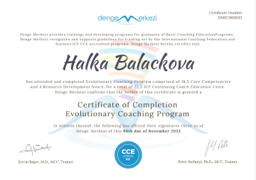 Evolutionary Coaching, pokročilá práce s klienty a koučování traumatu pod vedením Zerrin Bashar, MD, MCC z konce roku 2023.